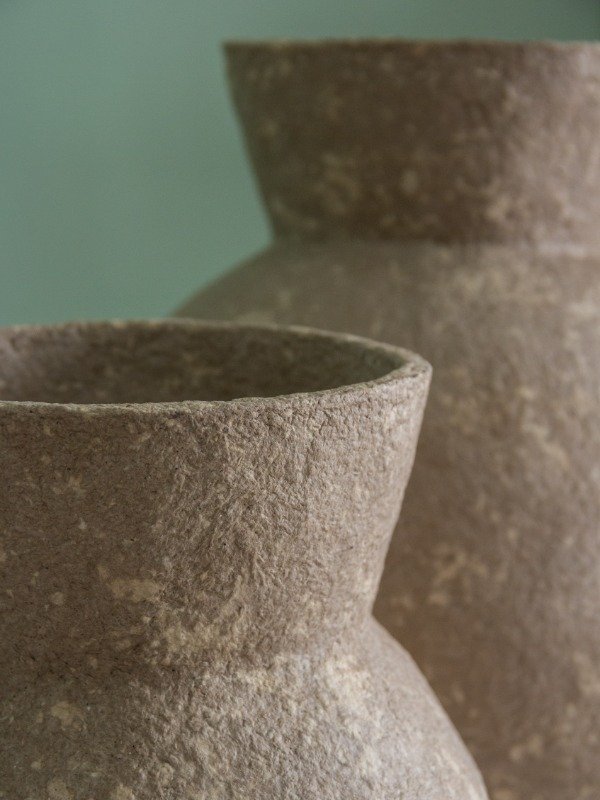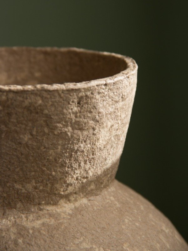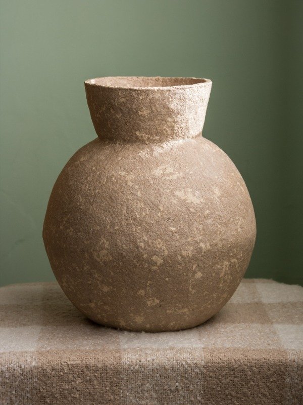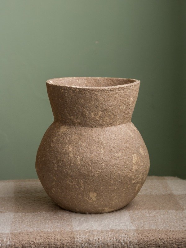 Vasija artesanal hecha de papel reciclado de diferentes tonos.